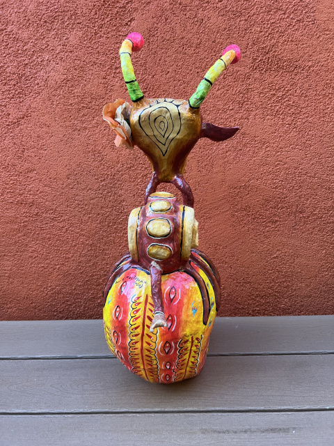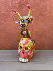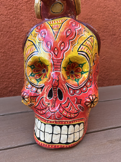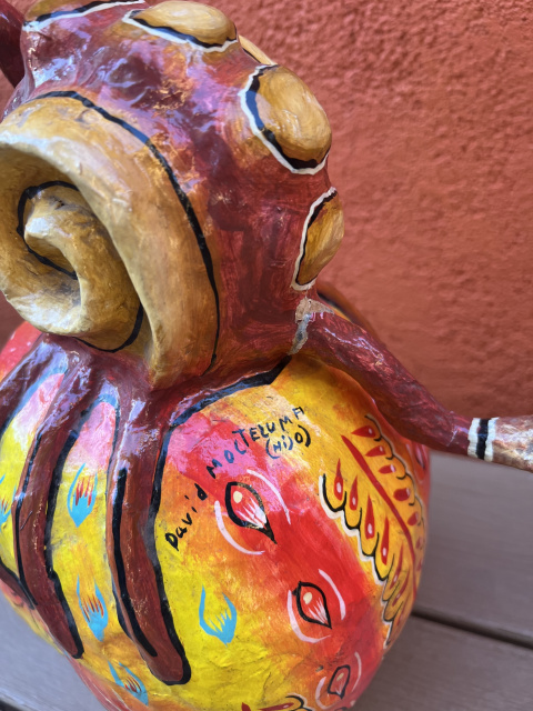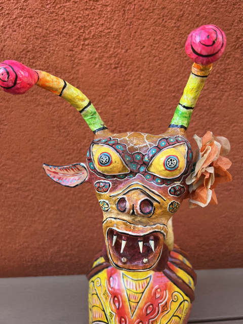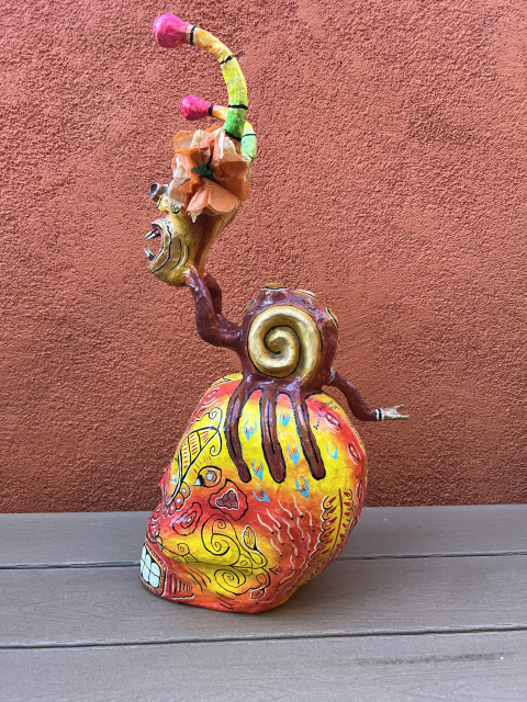 Rare and impressive papier mâché skull with alebrije by David Moctezuma, grandson of Pedro Linares. Wonderful composition, bright colors. In very good vintage condition with minor signs of wear due to age. The tail on the "snail" has a tear. See photos. Signed.